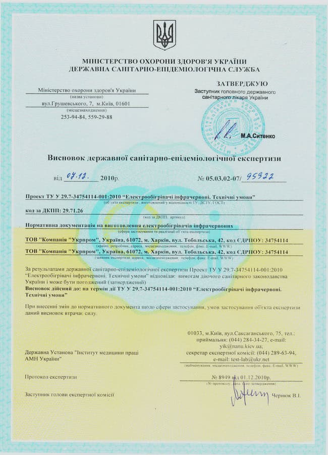 Декларація про відповідність – технічний регламент низьковольтного електричного обладнання Декларація про відповідність – Технічний регламент з електромагнітної сумісності обладнання Європейський сертифікат відповідності ТМ ТеплоV Висновок державної санітарно-епідеміологічної експертизи на виробництво Висновок саніарно-епідеміологічної служби України